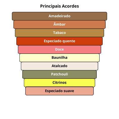 As notas de fundo são: Olíbano, Patchouli, Âmbar Claro e Cashmeran.