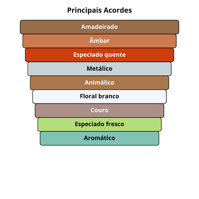 As notas de coração são: Madeira de Âmbar e Âmbar Cinzento.
