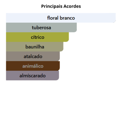 As notas de fundo são: Baunilha de Madagascar, Almíscar Branco e Cedro da Virgínia.