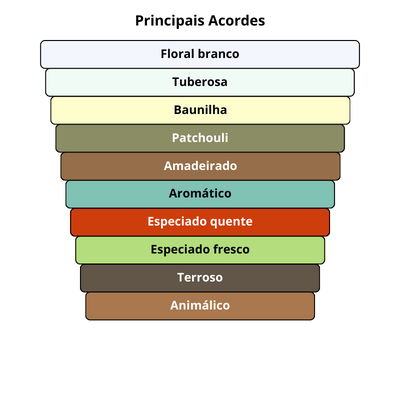 As notas de fundo são: Baunilha de Madagascar, Patchouli e Vetiver.