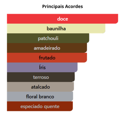 As notas de fundo são: Patchouli, Fava Tonka, Pralinê e Baunilha.