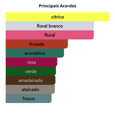 As notas de topo são: Flor de Macieira, Mandarina, Camélia e Groselha Preta.
