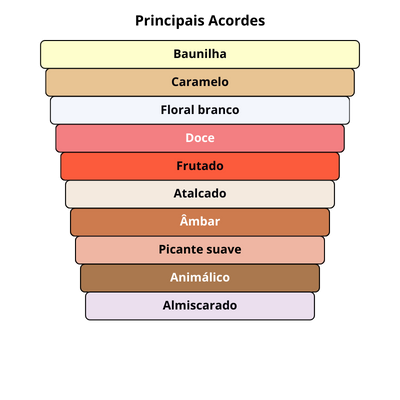 As notas de fundo são: Baunilha, Caramelo, Âmbar e Almíscar.
